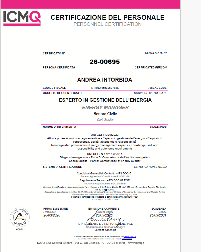 L’ing.Andrea Intorbida risulta abilitato EGE(Esperto in Gestione dell’energia)in base alla norma UNI CEI 11339